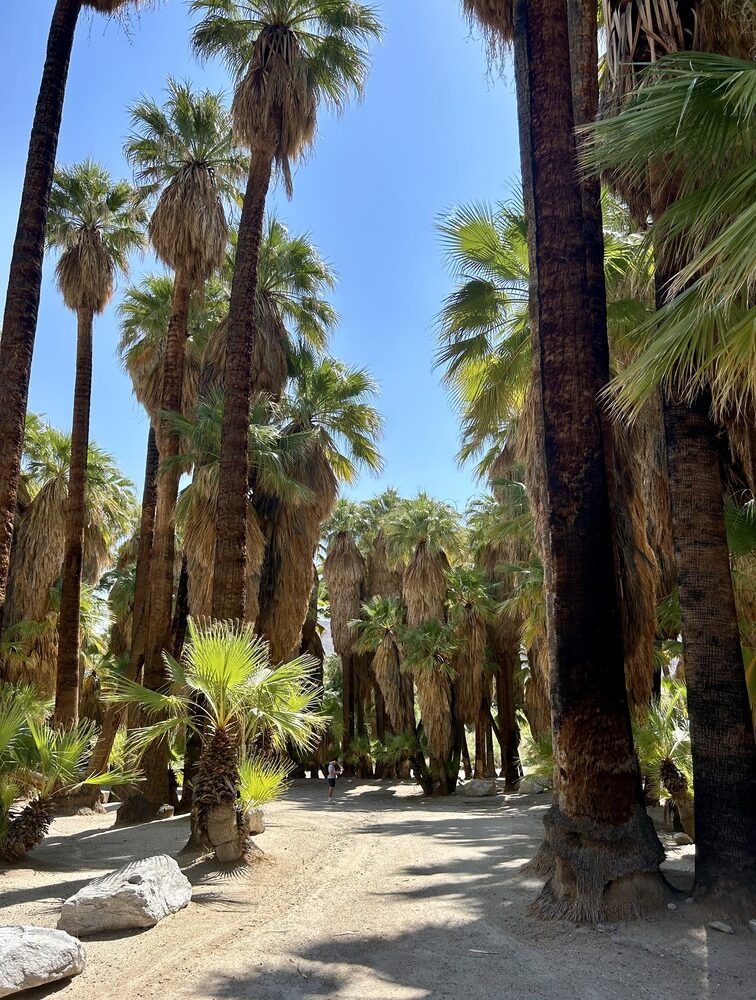 Daarna reden we naar de Indian Canyons, een natuurgebied net buiten Palm Springs. Met de auto verkenden we het park en stapten op verschillende plekken uit om korte stukjes te wandelen. Het contrast tussen de palmbomen, de rotsen en de droge woestijnomgeving was echt bijzonder.